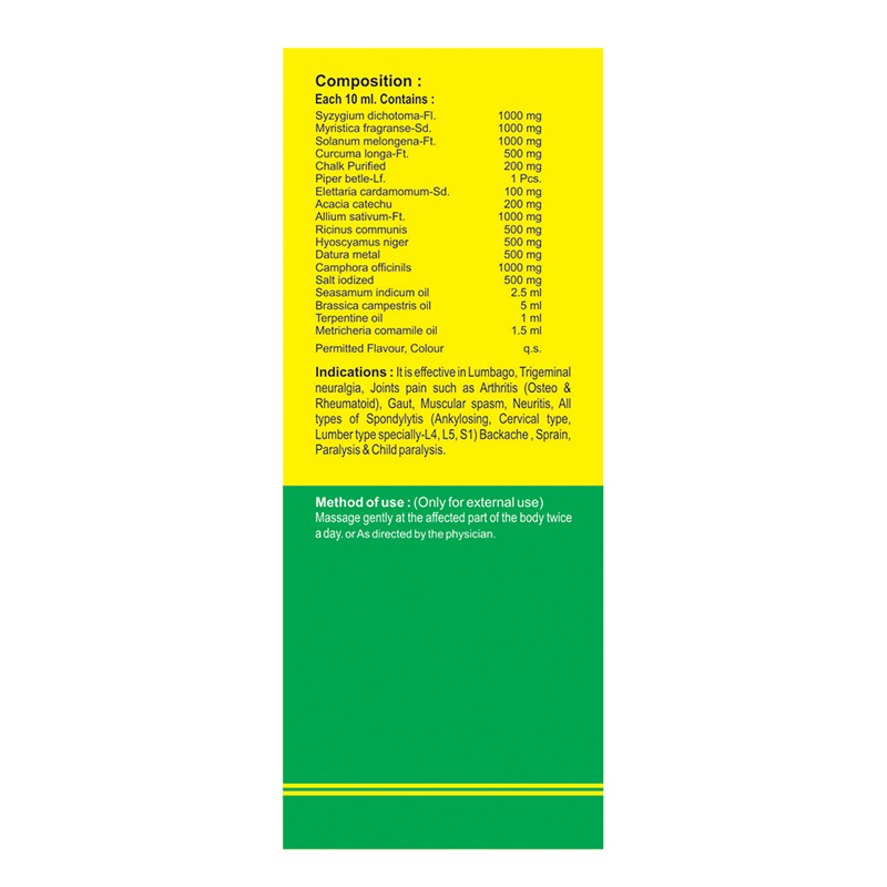 - Apply Analgesic oil on the affected area and massage gently. For best results, use it 2 to 3 times a day. or As directed by the physician.