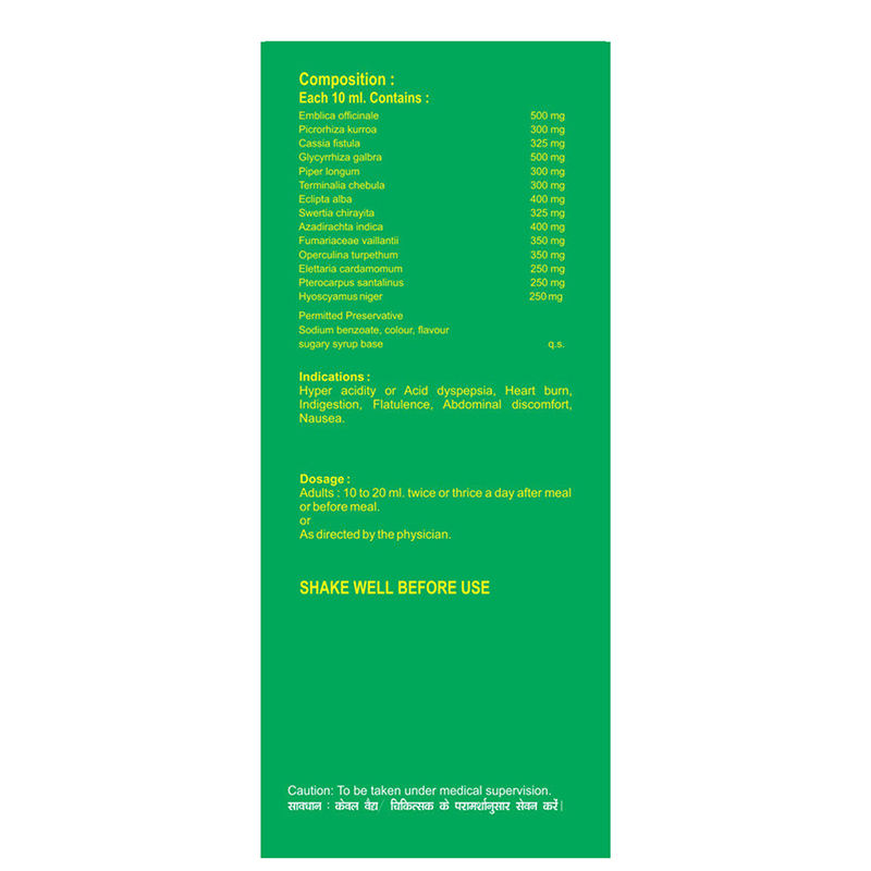 Amalki (Embelica officinale), Amlataas (Cassia fistula), Brhingraj (Eclipta alba), Chirayta (Swertia chirayita), Choti Elaichi (Elettaria cardamomum), Haritaki (Terminalia chebula), Kutki (Picrorhiza kurroa), Mulethi (Glycyrrhiza galbra), Neem Ki Chaal (Azadirachta indica), Nisoth (Operculina turpethum), Peepal choti (Piper longum) Pitt Papda (Fumariaceae vaillantii), Parsik Yavani (Hyoscyamus niger), Raktachandan (Pterocarpus santalinus).