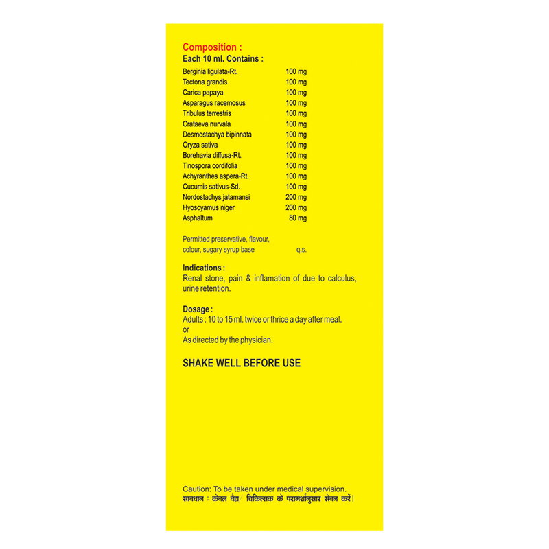 Apamarg Mool (Achyranthes aspera), Giloe Patra (Tinospora cordifolia), Gokshur (Tribulus terrestris), Jatamansi (Nordostachys jatamansi), Karkat (Carica papaya), Kush Mool (Desmostachya bipinnata), Kheera Kakdi Beej (Cucumis sativus), Khurasani Ajwain (Hyoscyamus niger), Pashan Behda (Berginia ligulata), Punarnava Mool (Borehavia diffusa), Shaali (Oryza sativa), Satavar Peeli (Asparagus racemosus), Sagon Pushp (Tectona grandis), Varna Chaal (Crataeva nurvala), Yav (Avena sativa), Sarji Khshar (Caroxylon fytidum).