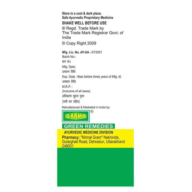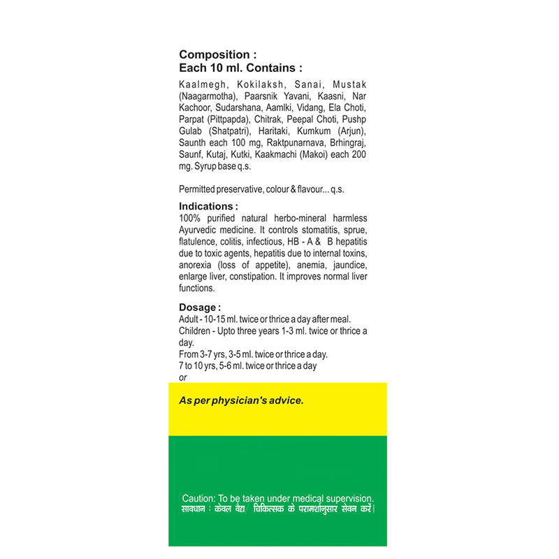 Syrup- Kalmegh (Andrographis paniculata ), Kokilaksha (Asteracantha longifolia), Rakta Punarnava (Boerhaavia diffusa), Sanai (Cassia angustifolia), Mustak/ Nagarmotha (Cyperus rotundus), Parsik Yavani (Carum copticum), Kasni (Cichorium intybus), Nar Kachoor (Curcuma zedoaria), Sudarshana (Crinum asiaticum), Amalki (Embelica officinalis), Brhingraj (Eclipta alba), Vidang (Embelica ribes), Sukshmela (Elettaria cardamomum), Pittpapda (Fumaria indica), Saunf (Foenicum vulgare), Kutaj (Halarrhena antidysentrica), Kutki (Picrorrhiza kurroa), Chitrak mool (Plumbago zeylanica),Pipal Choti (Piper sylvestricum), Gulab Pushp (Rosa centifolia), Makoi (Solanum nigrum), Haritaki (Terminalis chebula), Arjun (Terminalia arjuna) Sonth (Zingiber officinale).