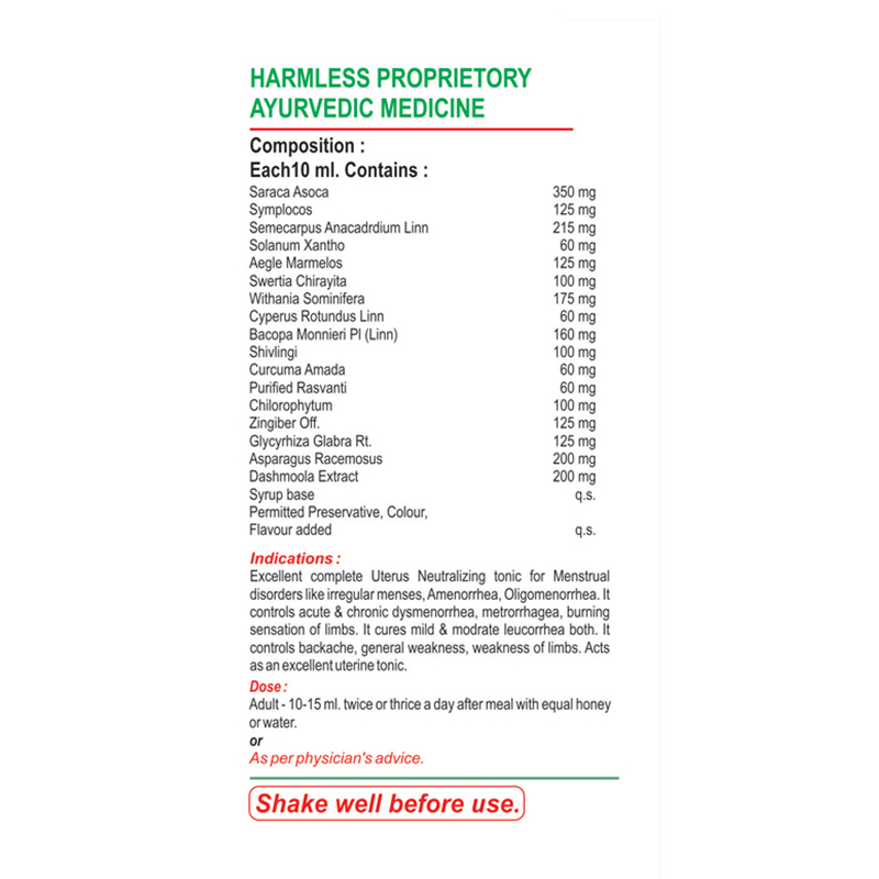 Ashok Chaal (Saraca asoca), Lodhra (Symplocos racemosa), Bhilava Sudh (Semecarpus anacardium), Kantkari (Solanum surattense), Bilv Giri (Aegle marmelos), Chirayta (Swertia chirayita), Asgandh (Withania sominifera), Mustak/ Nagarmotha (Cyperus rotundus), Brhami (Bacopa monnieri), Shivlingi beej (Bryonia laciniosa), Shivlingi (Amba Haldi), Curcuma amada (Berberis aristata), Safed Musli (Chlorophytum borivilianum), Shunthi (Zingiber officinale), Yasti Madhu (Glycyrhiza glabra), Shatavari (Asparagus racemosus), Dashmool (AFI).