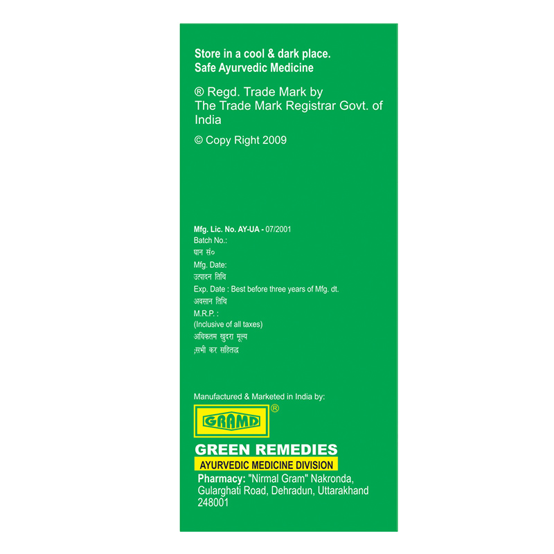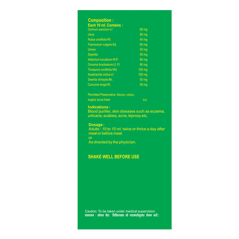 Suspension: Chirayata (Swertia chirayita), Gavjvan (Onosma bracteatum), Giloe (Tinospora cordifolia), Hansraj (Adiantum lunulatum), Haridra (Curcuma longa), Manjistha (Rubia cordifolia), Neem Ki Chaal (Azadirachta indica), Saunf (Foeniculum vulgare), Sariva (Hemidesmus indicus), Sapista (Lisoda) (Cordia dichotoma), Tulsi (Ocimum sanctum), Unnav/ Kola (Zizyphus jujuba).