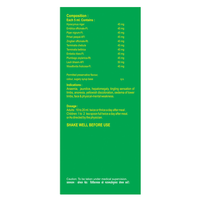 Aamalki (Emblica officinale), Chitrak Mool (Plumbago zeylanica), Dhatki Pushp (Woodfordia fruticosa), Haritaki (Terminalia chebula), Kali Mirch (Piper Nigrum), Lauh Bhasm (Oxide of Ferum), Prhari Peepal (AFI), Shunthi (Zingiber officinale), Vibhitak (Terminalia bellirica), Vaividang (Embelia ribes), Yavani (Hyoscymus niger)